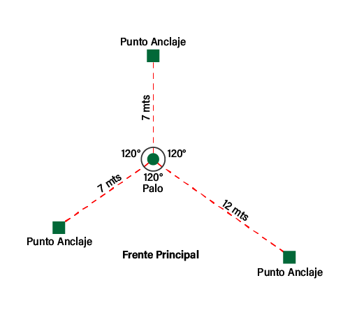 Es preciso contar con cuatro puntos de anclaje que forman un rombo, o tres distribuidos en forma triangular. Estos pueden ser pesos de 1.000 Kg. (agua, cemento, arena, etc) en cada punto de anclaje. También podemos utilizar estacas en la tierra, brocas colocadas en hormigón, columnas, árboles, autos, etc.