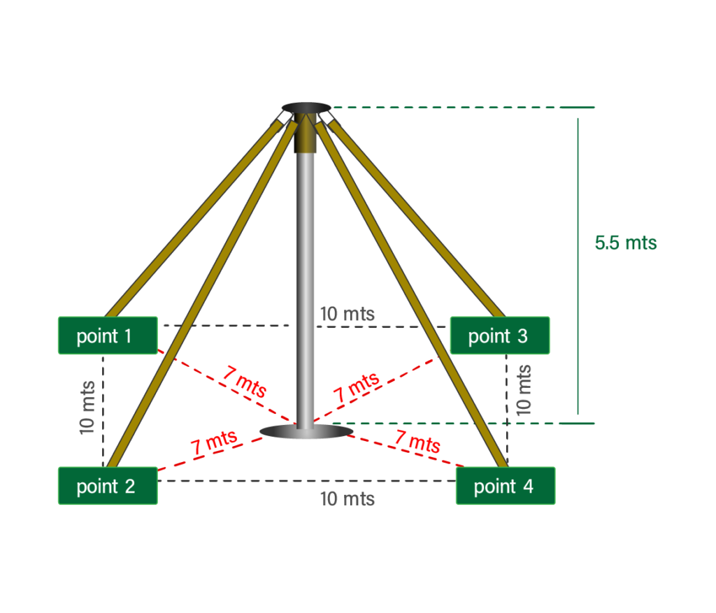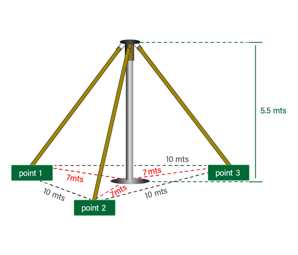 It must have four anchor points forming a square or three points distributed in a triangular shape. Preferably four. These can be 1.000 kg weights (water, cement, sand, etc.) in each anchor point. We can also use columns, trees, cars, etc. as well as stakes into the ground.